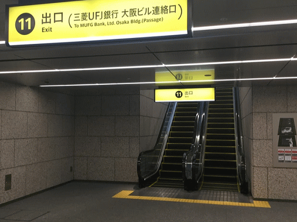 ⑪番出口のエレベーターまたはエスカレータ・階段で地上に出る。 -